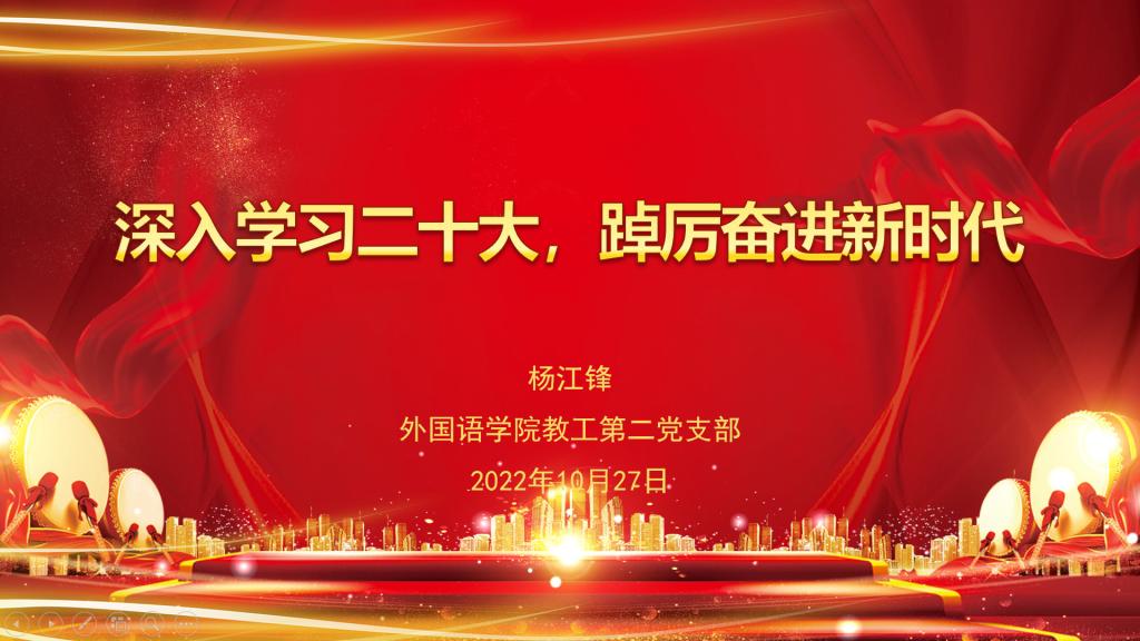 为深入学习党的二十大报告,深刻理解二十大精神,Beat365唯一官方网站党总支10月27日组织三个党支部共同上党课《深入学习二十大,踔厉奋进新时代》,由Beat365唯一官方网站教工第二党支部书记杨江锋主讲。