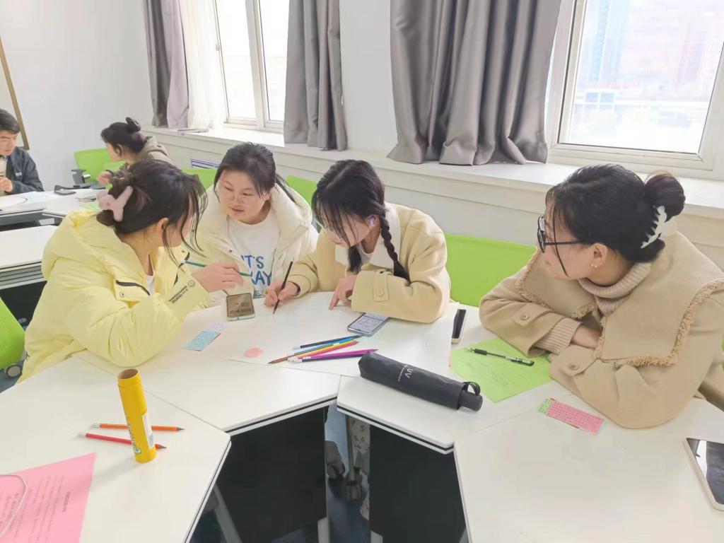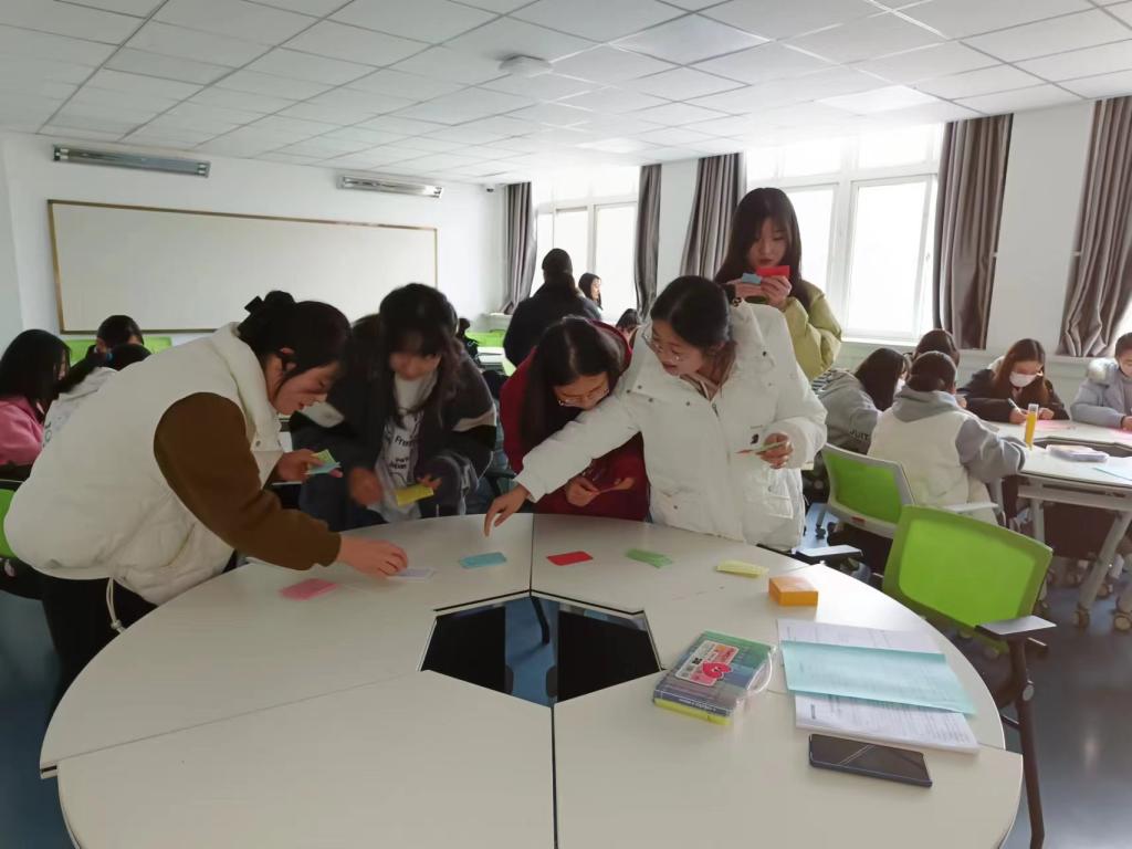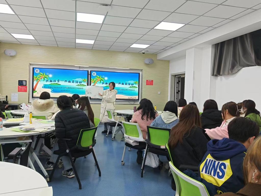 简要开题后,两位老师为同学们带来了霍兰德职业兴趣测试:假设同学们获得了一次免费度假游甚至永久定居的机会,有机会去六个岛屿中的一个,在不考虑其他因素的情况下,仅凭自己的兴趣爱好选择想去的岛屿。同学们都很活跃,纷纷从自然原始的岛屿、深思冥想的岛屿、美丽浪漫的岛屿、友善亲切的岛屿、显赫富庶的岛屿、现代井然的岛屿中快速做出了选择。大多数同学都选择了美丽浪漫的岛屿、友善亲切的岛屿、显赫富庶的岛屿和现代井然的岛屿,很少有同学选择深思冥想岛和自然原始岛。接下来同学们按照自己所选的岛屿类型围坐在一起,“建立”起属于自己的“社区”,全体“岛民”共同商讨岛屿的命名,通力合作将想象中的岛屿画成海报,最终派代表向同学们宣传介绍,吸引其他岛上的居民前来参观和生活。