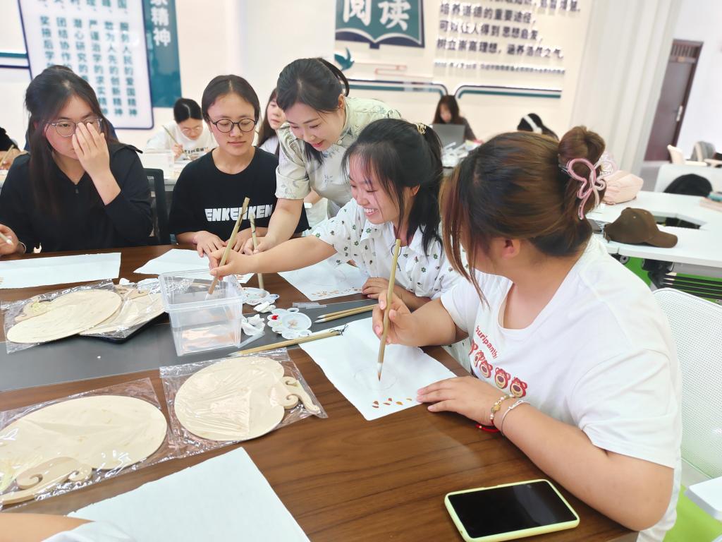 座谈会伊始,师生们围坐一堂,共同聆听了吉玉珍、高倩、万梓蔷和黄亦芯共4位学生代表为大家带来的民族团结故事。这些故事跨越时空,讲述了各个民族间相互尊重、和谐共处的美好瞬间,体现了中华大家庭的温暖与力量。同时学院特别邀请了画廊的王雯老师为大家展示了石榴的绘画技巧,引导大家沉浸式体验中国团扇绘画创造的全过程。在了解团扇绘画的基本技法和要领后,大家拿起毛笔,在王老师的指导下,一幅幅扇面在一支支画笔的渲染勾勒下,逐渐变得鲜活起来,大家都沉浸在扇面画的创作中。
