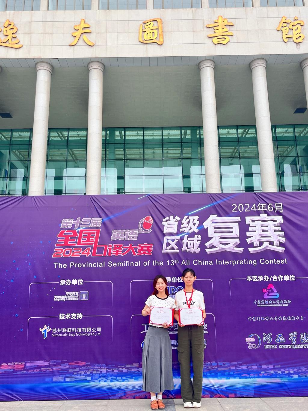 6月28日--29日,第十三届全国口译大赛(英语)西北赛区复赛在河西学院举行。Beat365官网Beat365唯一官方网站2022级学科教学(英语)专业硕士研究生徐凌波、2023级学科教学(英语)专业硕士研究生张晓萌荣获二等奖,2023级学科教学(英语)专业硕士研究生李姣、闫雨萌荣获三等奖。