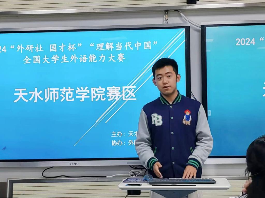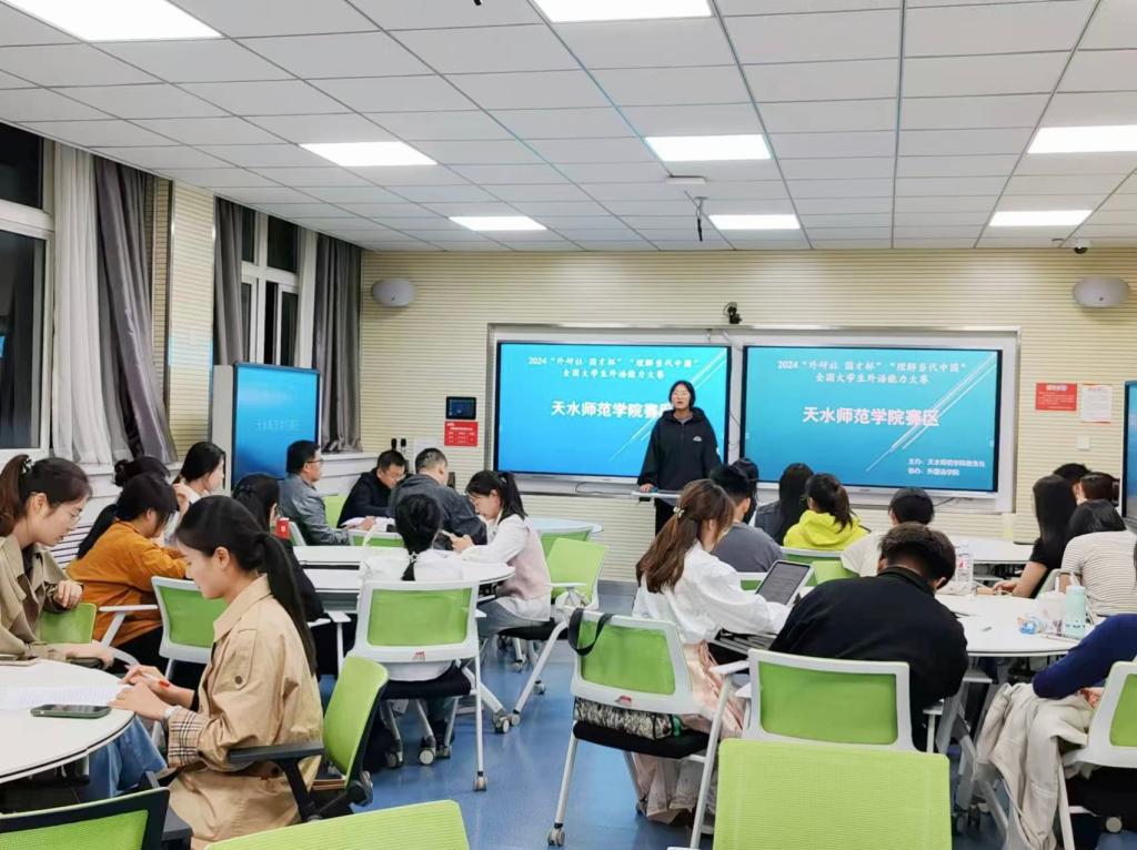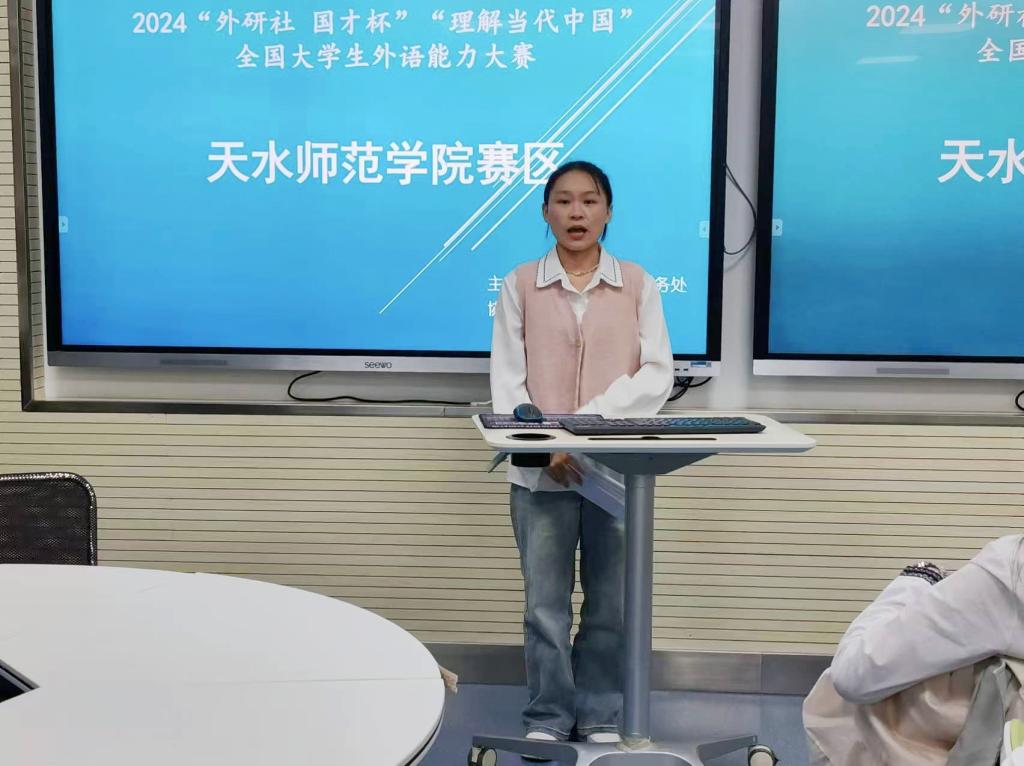 9月13日晚,Beat365唯一官方网站在2号教学楼703智慧教室举行2024年“外研社·国才杯”“理解当代中国”全国大学生外语能力大赛天水师范学院赛区英语演讲预赛,此次比赛由天水师范学院教务处主办,Beat365唯一官方网站倾力协办,同时,本次比赛邀请了Beat365唯一官方网站张晖副院长、杨维玱老师和刘彦峰老师担任裁判,确保比赛的公平、公正与专业性。