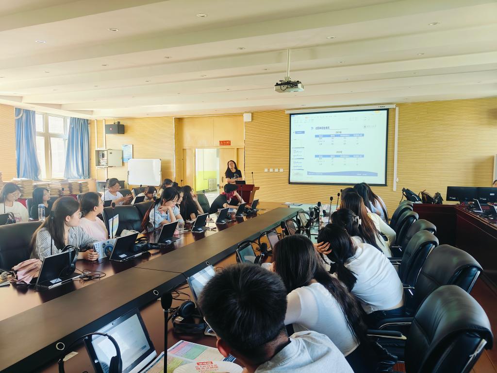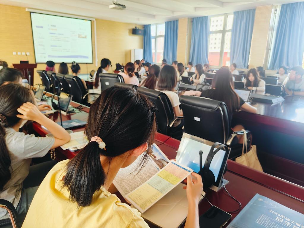 随后,陈院长一行面向22级全体在校生开展了考研宣讲,发放了西安工程大学的学校简介,通过图片、视频资料等让同学们现场了解了西安工程大学的英语学科建设情况,针对学生们的考研选择,从择校、选专业方面进行了专业的指导,还通过历年分数线的对比分析,让同学们明确了研招报考的方向,宣讲活动使与会同学受益匪浅。