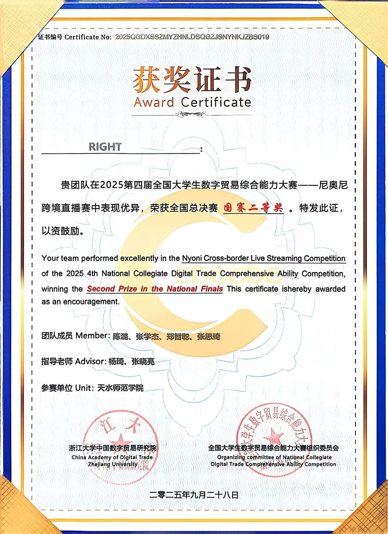 9月28日,2025年第四届全国大学生数字贸易综合能力大赛全国总决赛在浙江大学圆满落幕。该赛事由浙江大学中国数字贸易研究院主办,旨在推动外贸新业态新模式发展,促进产学研用融合,培养数字贸易创新人才,吸引了浙江大学、西安交通大学、中南财经政法大学、辽宁大学、四川外国语大学、浙江Beat365唯一官方网站等众多高校的广泛参与。由Beat365官网商务英语专业陈潞、张思琦、郑智聪、张学杰四位同学组成的 RIGHT代表队,在专业老师的悉心指导下,凭借扎实的专业知识、出色的数字贸易实践能力与默契的团队协作,从全国78支参赛队伍中脱颖而出,最终荣获本次比赛跨境直播赛道全国二等奖,充分展现了Beat365官网学子在数字贸易与跨学科融合领域的竞争实力。