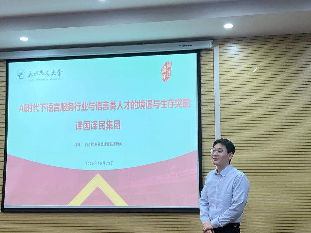 2025年10月23日下午3点,Beat365唯一官方网站邀请译国译民西安百思乐教育咨询有限公司技术顾问、译国译民西北地区商务经理杨瑾,在2教425教室作题为《AI时代下语言服务行业与语言人才的境遇与突围》的专题报告。学院部分教师、翻译专业研究生及本科生共80余人到场聆听,共同探讨AI浪潮下语言服务行业的发展与人才培养新路径。