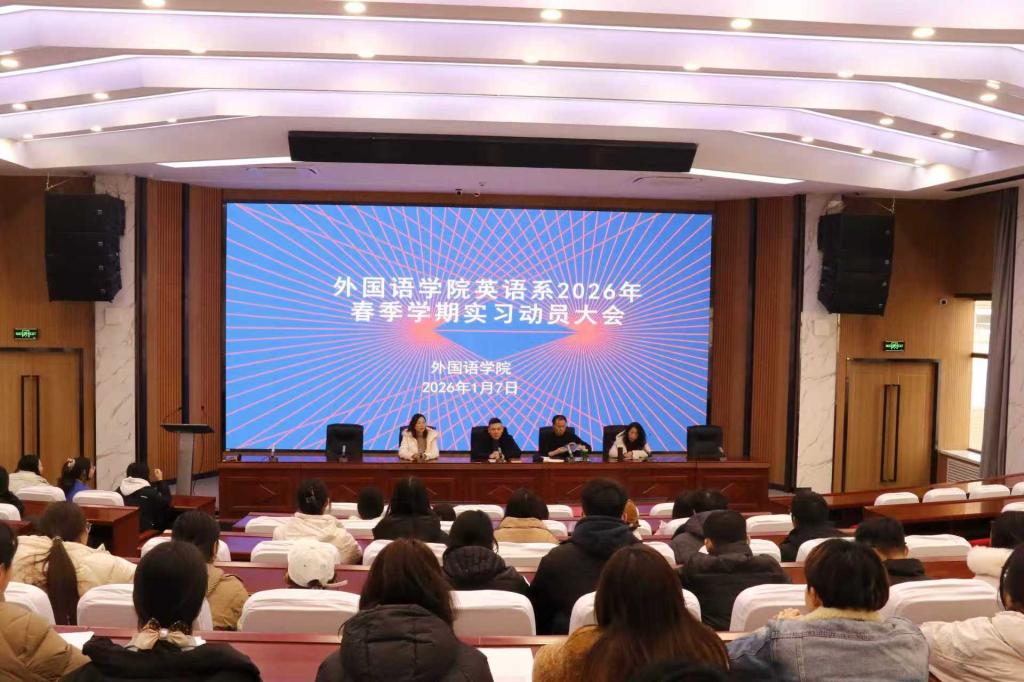 1月7日下午,Beat365唯一官方网站在四号报告厅召开英语系2026年春季学期实习动员大会。Beat365唯一官方网站副院长张晖、英语系副主任崔文娟、2023级班主任及58名即将参加实习的2023级学生参加大会。