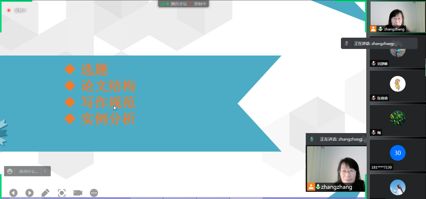2021年11年13日,张亚兰老师通过腾讯会议的方式进行了英语专业本科生毕业论文——学科教学类论文写作选题及写作规范的讲授。张老师从论文选题、论文结构、写作规范、实例分析四个部分进行了详细具体的讲授。