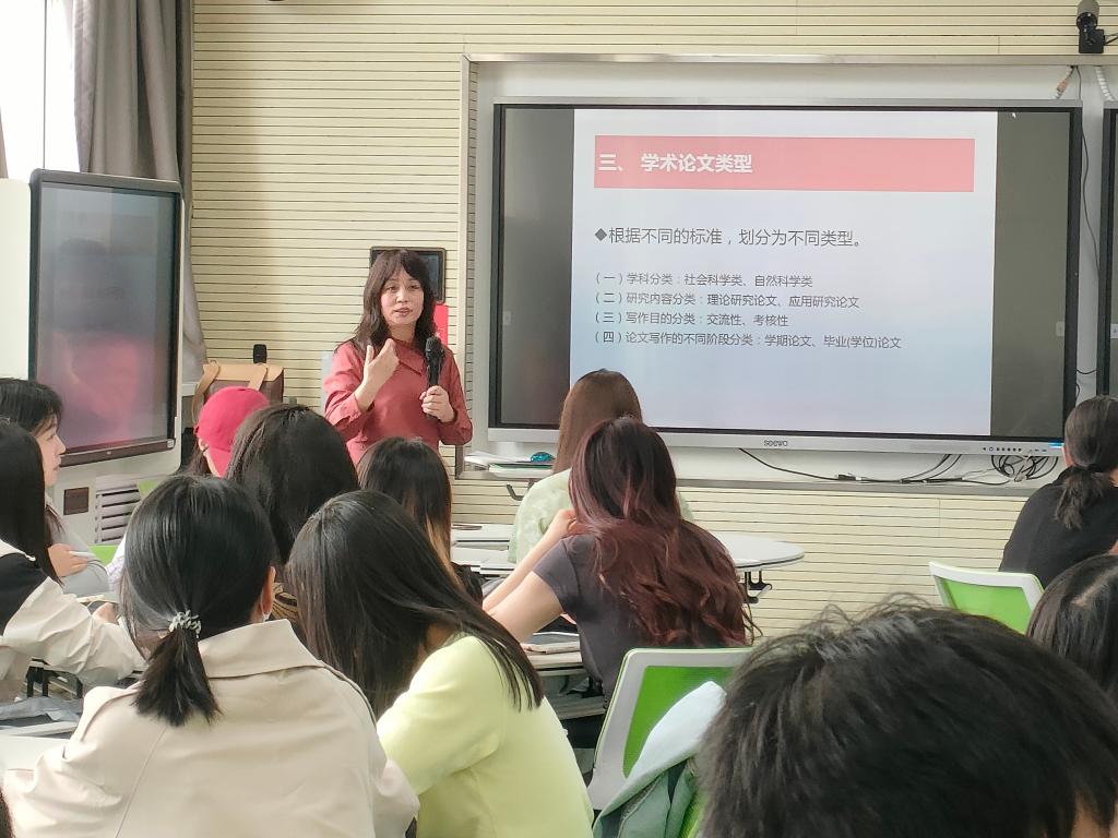 郭老师主要围绕学术论文的概念、特征、类型、写作过程、基本结构、论文的修改和引用等方面进行了详细讲解。其中,郭老师着重介绍了学术论文的写作过程和基本结构,并强调,学术论文一定要体现“新”,新的学术思想、新的学术观点、新的研究方法、新的研究材料。同时好的学术论文一定要具有可读性,在写作的过程中要具有读者意识。